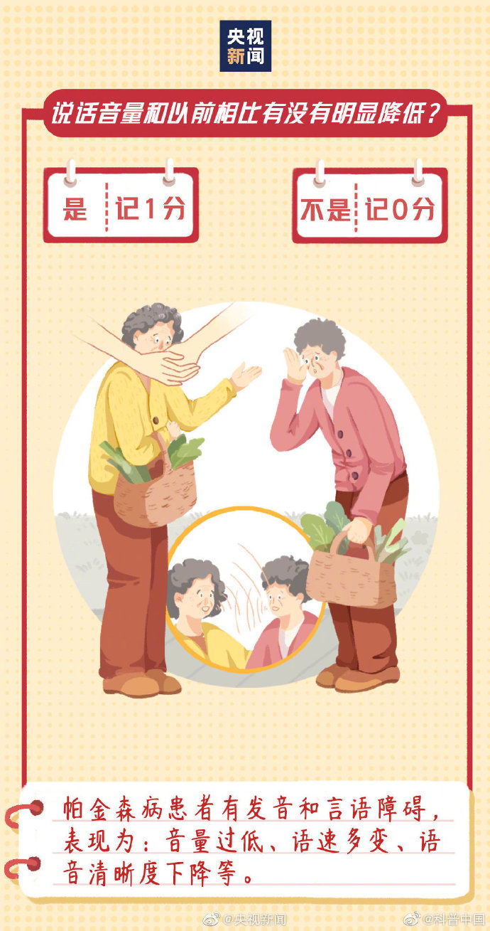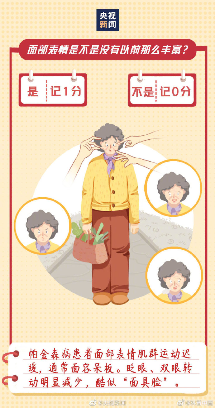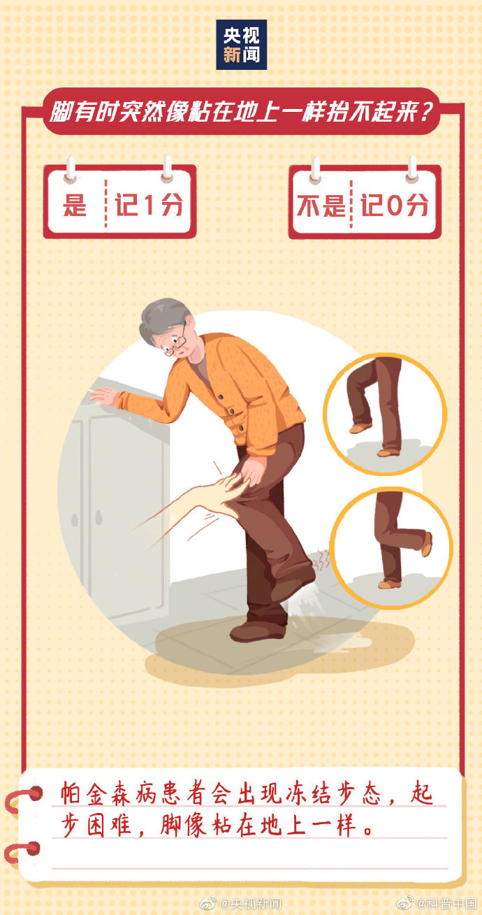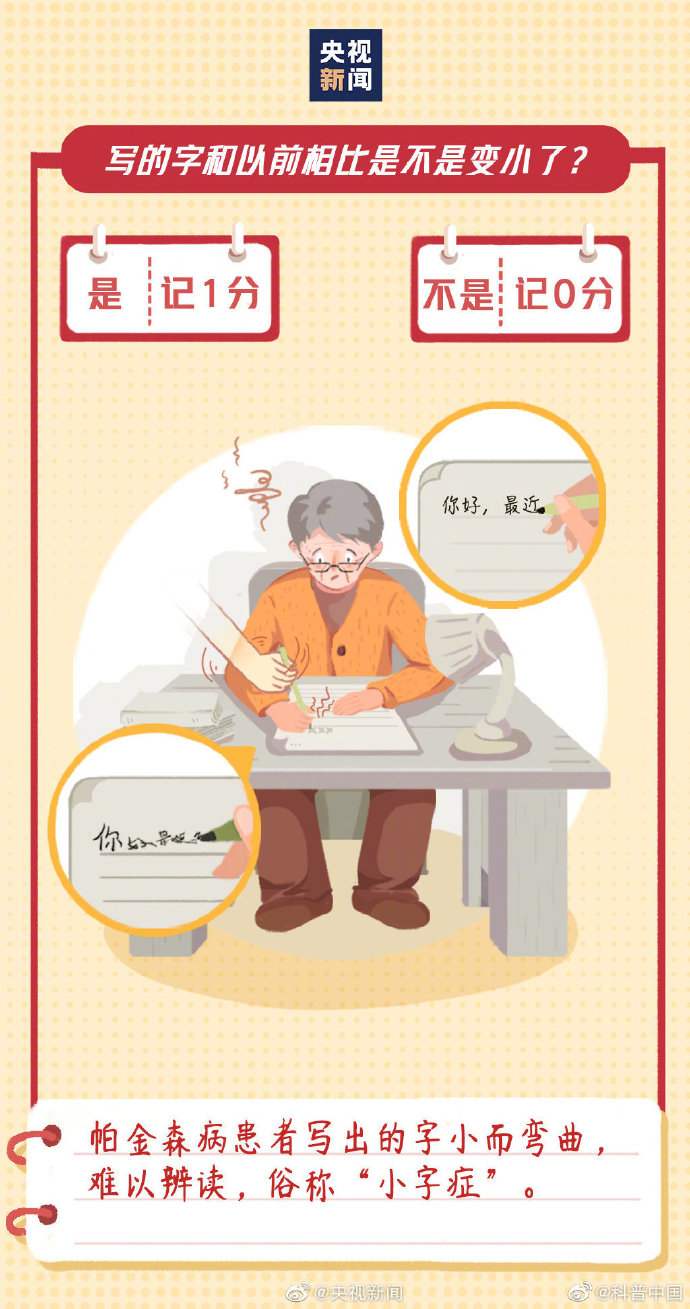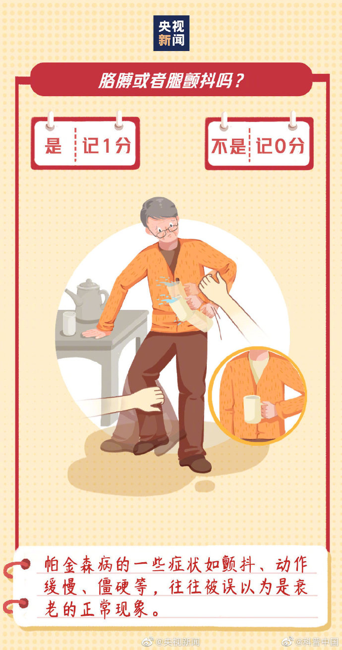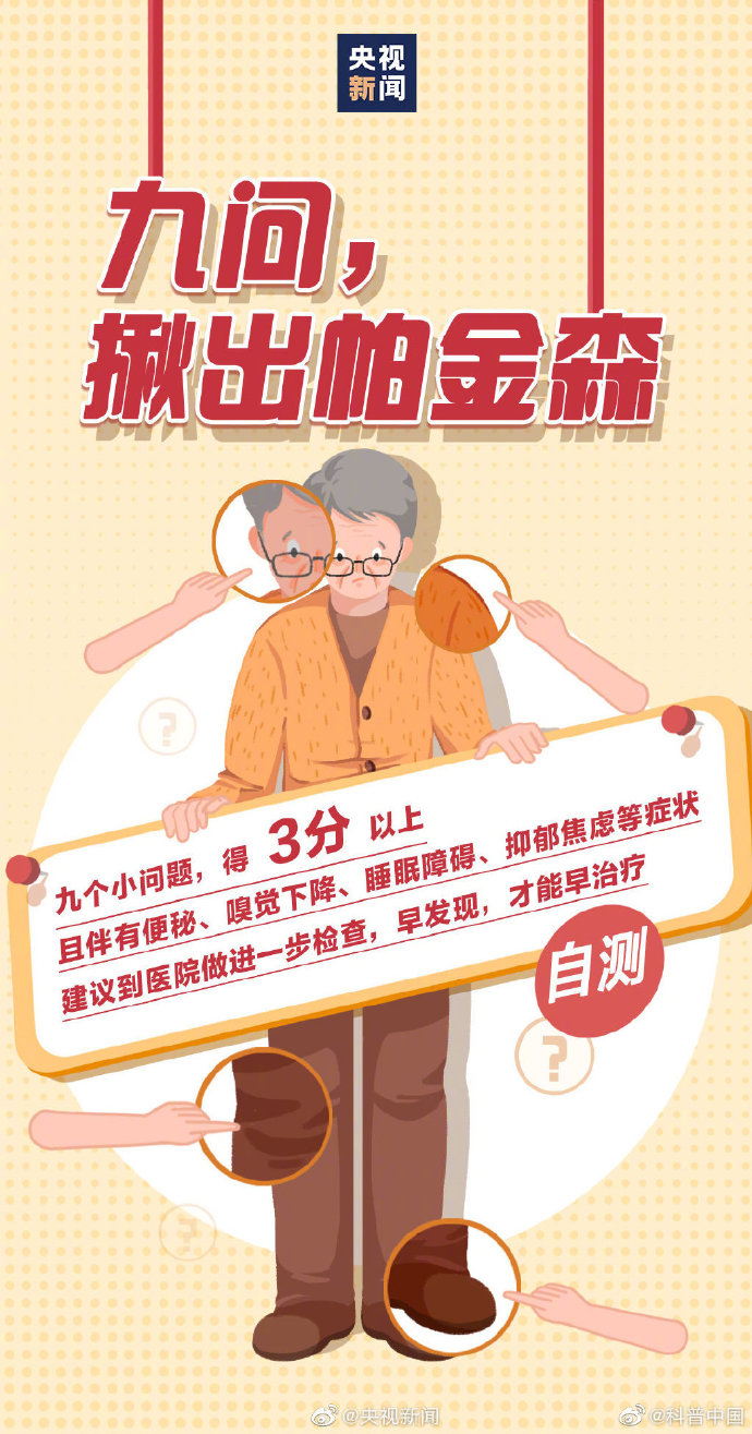 #9个问题测试帕金森风险#】今天是世界帕金森病日。不只是老年人,青少年也有可能患帕金森病。早期有哪些症状?如何预防和治疗?这9个问题,若总得分超过3分,一定要重视↓↓#帕金森病的这些症状常被忽视# ? ???